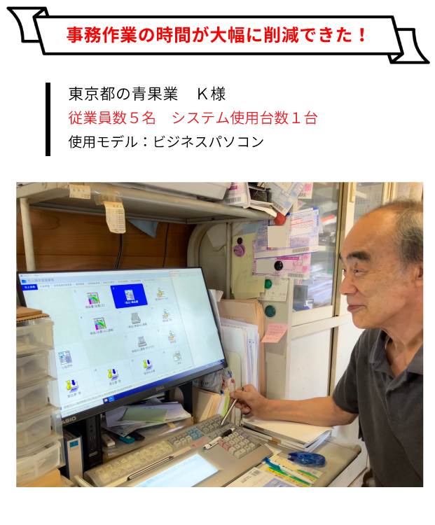 以前は、伝票は手書きが多く、コクヨの伝票を全て手書きで、市場で使う仕入書ももちろん手書きでした。野菜を育て、箱詰めなどの作業に追われる中での伝票作成には大変苦労していました。