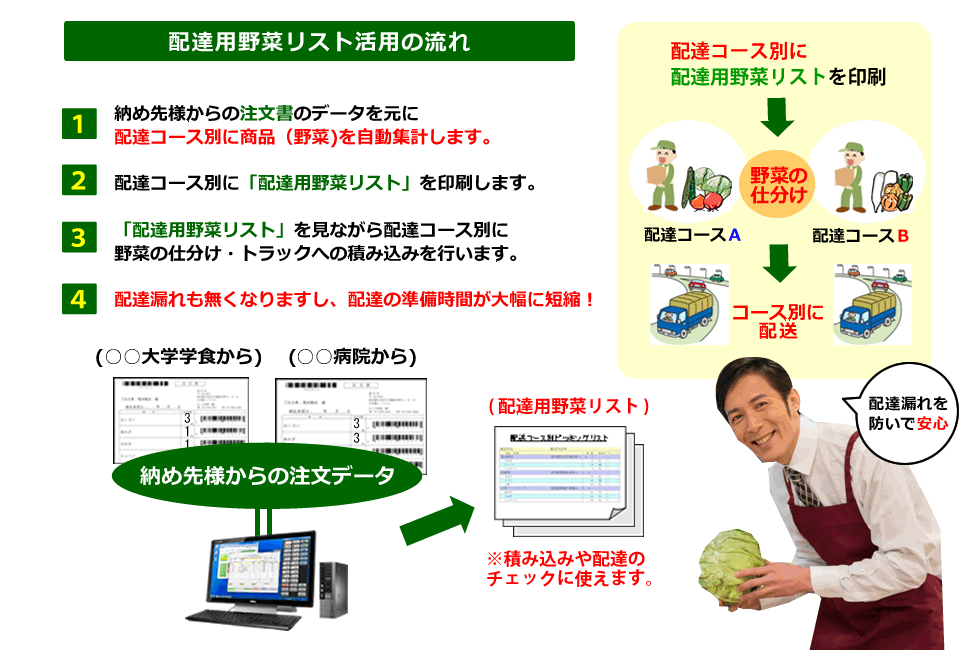 配送コース別・得意先別のピッキングリストを作成することができます。受注リストを目で確認しながら手入力する必要がなく、自動で正確なピッキングリストが作成できます。作業時間の短縮に繋がります。