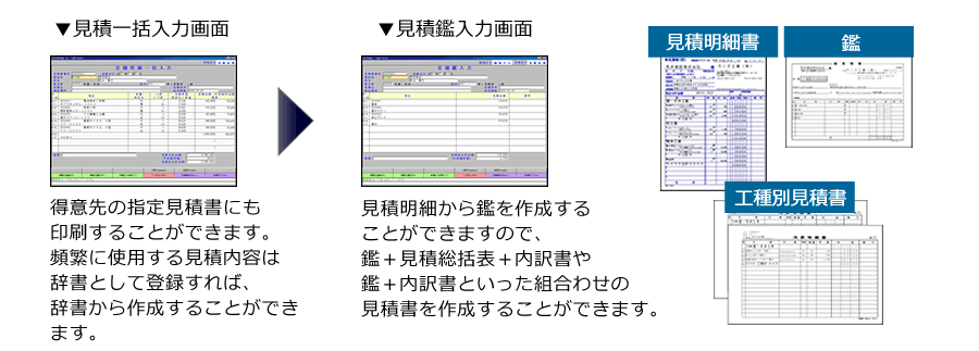 | 見積書をそのまま表示 | 固定画面での入力のほかに、パソコン画面に今使用している見積書のイメージを表示し、入力することが可能です。出力では、複写式見積書や指定見積書などご希望の書式に合わせて印刷することができます。 |