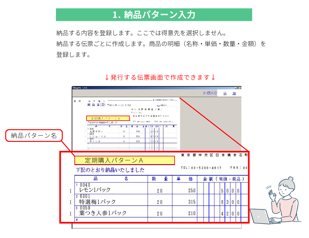 納品(売上)の内容(納品パターン入力)と日付・曜日など納品サイクルを登録すれば、納品書は自動で作成できます。