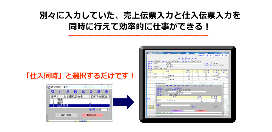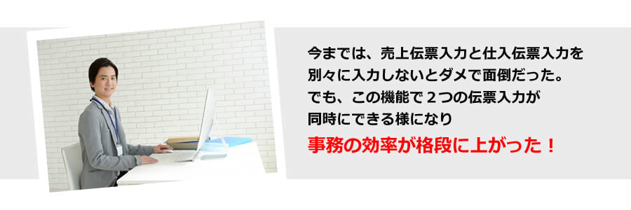 商品在庫を持たない会社様などに最適な機能です。入力の手間の軽減と、入力ミスを防止できます!今までバラバラに入力していた売上伝票入力と仕入伝票入力を同時に行うことで、2度手間を無くし、入力ミスを防止できます。