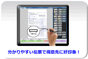 画面に表示されている伝票に専用のペンやマウスを使って、図やメモを書くことが可能です。言葉では説明が難しい部分を分かり易く表現できます。新商品など、得意先に強調したい時にも便利です。