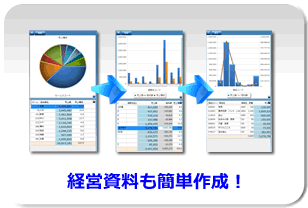 日々、蓄積されたデータを元に、様々な経営分析が可能です。営業資料や経営資料も正確な実績データですぐに作成できます。グラフの種類も豊富で会議でも活用でき、経営効率アップを目指せます!もっと詳しくはコチラへ