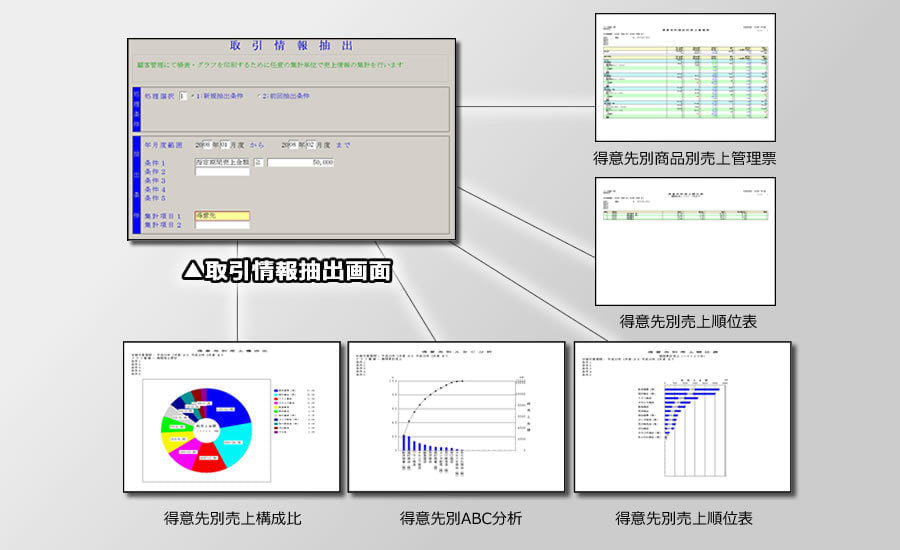 締め日、商品、指定期間売上金額、売上回数、担当者、最終売上日、売上累計金額、得意先ランクなど、必要に応じて検索した情報を呼び出して集計することが簡単に出来ます!作業の効率もアップします。