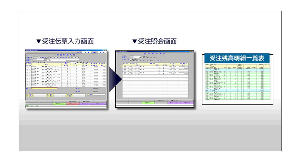 受注残数量は、受注を受けたが未だ売上として処理されていない(出荷していない)状態の数量を表します。その受注残情報を得意先別や出荷予定日別に画面に表示することが出来ます(受注照会画面)。また、出荷予定日別の一覧表を印刷することも可能です。これで、漏れのない受注管理が可能となります。