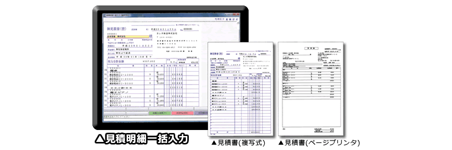 見積書をそのまま表示 | 固定画面での入力のほかに、パソコン画面に今使用している見積書のイメージを表示し、入力することが可能です。出力では、複写式見積書や指定見積書などご希望の書式に合わせて印刷することができます。 |