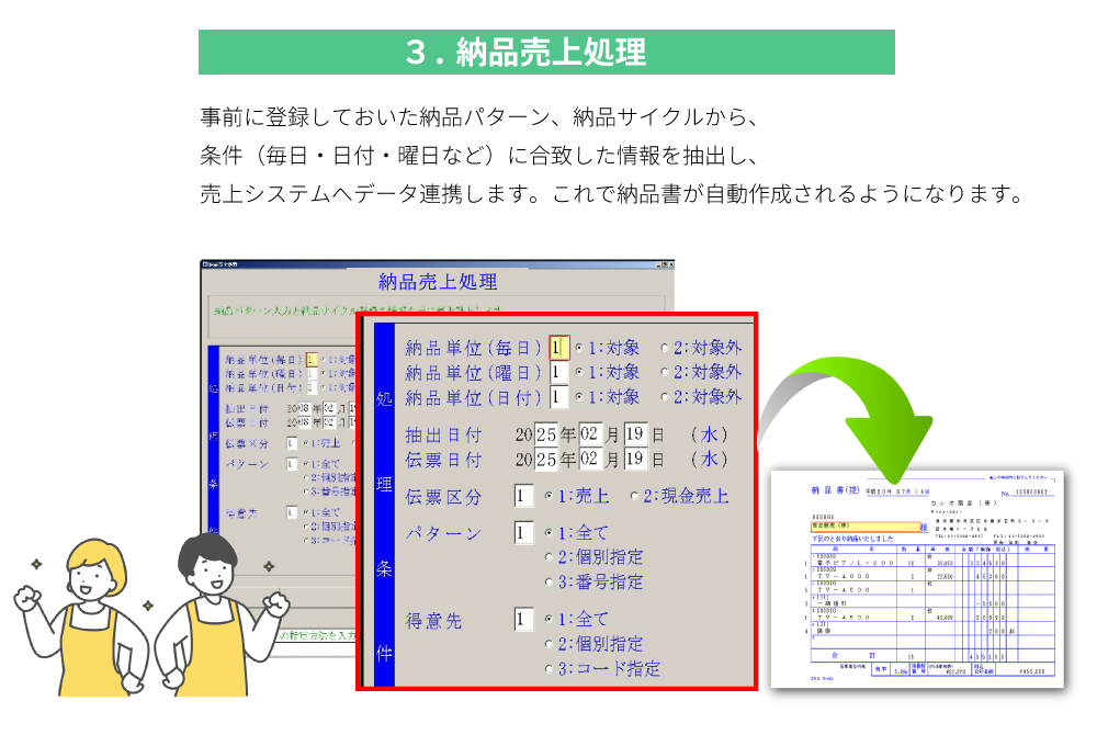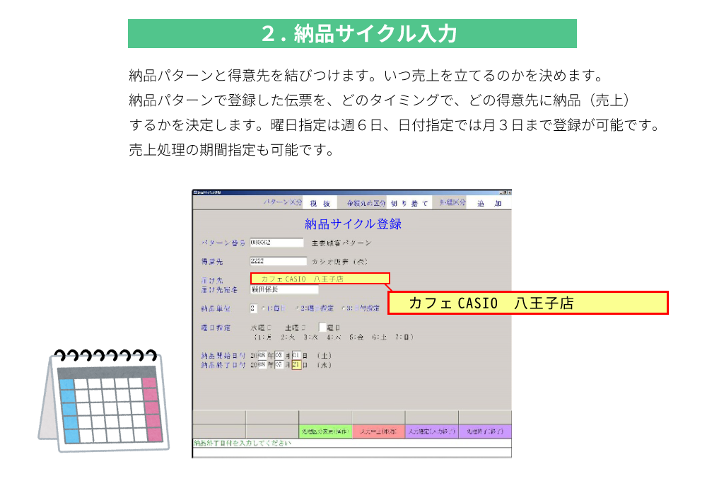 納品(売上)の内容(納品パターン入力)と日付・曜日など納品サイクルを登録すれば、納品書は自動で作成できます。