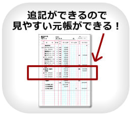 前回入力した行から再び追記することが可能です。入力する度に新しい元帳を用意する必要がないので、紙のムダを無くすと共に、見やすいまとまった元帳ができます。